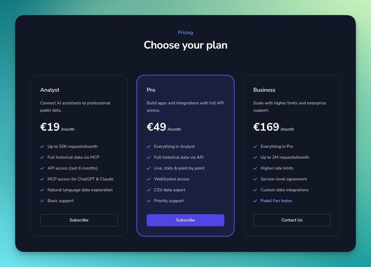 We’ve introduced a new entry-level plan designed for data analysts, journalists, and padel enthusiasts who want AI-powered access without full API integration:- Up to 50K requests/month